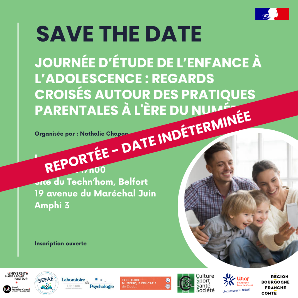 Conférence 09octobre 2025 De l’enfance à l’adolescence : regards croisés autour des pratiques parentales à l'ère du numérique 8h45 à 16h30Animée par Nathalie CHAPON et Annie LASNE Lieu iUT Nord Franche-ComtéAmphi 3 – Bât. GC-CD